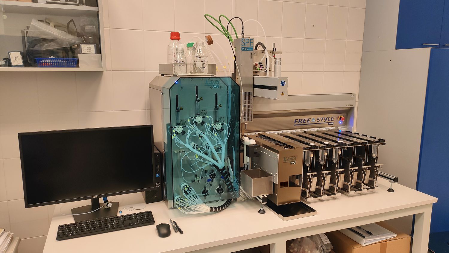 The FREESTYLE XANA (specifically, the FREESTYLE XANA PFAS TableTop) is a robotic system developed for fully automated sample preparation. Its operating principle is based on solid phase extraction (SPE). The system has been specially designed for automated SPE of large-volume aqueous samples, such as drinking water, raw water, or surface water. The automation includes all common SPE steps – conditioning, sample loading, washing, drying, and elution. The FREESTYLE XANA PFAS TableTop allows fully automated processing of up to 30 samples in a single sequence, without the need for analyst supervision, and supports continuous operation (24/7). High throughput is achieved through the parallel processing of up to six SPE cartridges simultaneously. The system uses controlled pressure to deliver liquids onto the SPE cartridges, which is particularly important when working with samples containing suspended solids (e.g., wastewater). The robotic system is primarily intended for the determination of per- and polyfluoroalkyl substances (PFAS), which have been analyzed at the Institute of Food Analysis and Nutrition since 2010. Since these analyses need to be performed at ultra-trace levels, it is essential to eliminate contamination (so-called blank values) originating directly from the instrument. This is achieved by a specific design modification of the FREESTYLE XANA system, which is practically free of fluorocarbon materials (e.g., PTFE) that could otherwise release PFAS and increase blank values. The extracted eluate, once the SPE process is complete (and concentrated if required), is ready for subsequent analysis using liquid chromatography coupled with tandem mass spectrometry (LC-MS/MS).